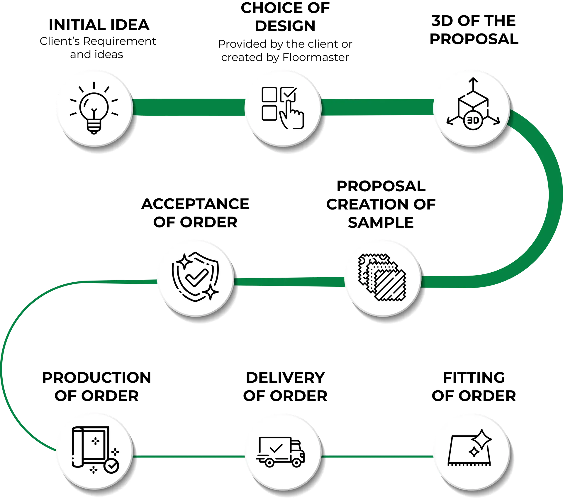 Here’s a detailed breakdown of our bespoke flooring process at Floormasters, ensuring a seamless and personalized experience from concept to completion: